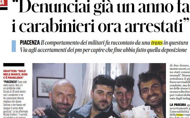 “Sono andata in questura – dice la donna –per avvertire che c’era un carabiniere che si approfittava della mia situazione di inferiorità e mi chiedeva prestazioni sessuali”. Sono circostanze che la trans dice di aver ripetuto più volte in caserma, finché un giorno il suo racconto è stato verbalizzato da una poliziotta. “Ma non ne conosco l’esito”, aggiunge. Che fine ha fatto quindi questa segnalazione? Gli investigatori della Procura di Piacenza non ne sanno nulla. Non ve ne è traccia infatti nel fascicolo che qualche giorno fa ha portato all ’arresto di sei carabinieri (tutti in carcere tranne uno ai domiciliari), accusati a vario titolo di abuso d’ufficio, lesioni, spaccio di droga e tortura.